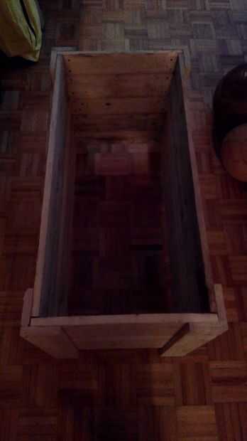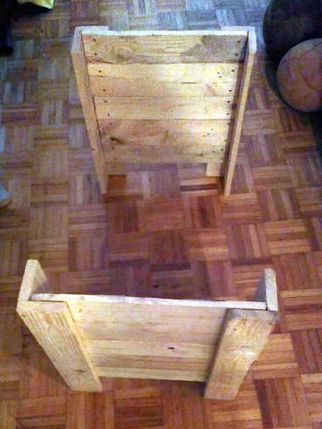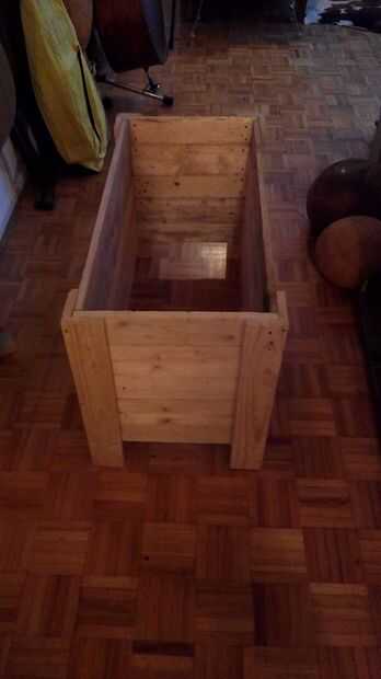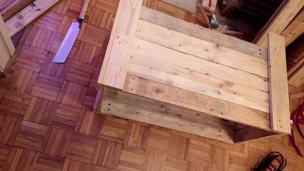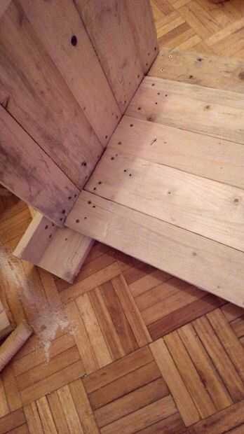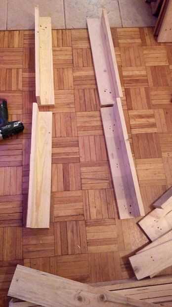 Empecé con las esquinas y luego atornillar los lados cortos en estos. Cuando tanto los lados cortos caben en los lados largos y después de eso tornillo de dos listones en los interiores en la parte inferior de la caja. Sobre estos listones se acoplará la placa inferior.