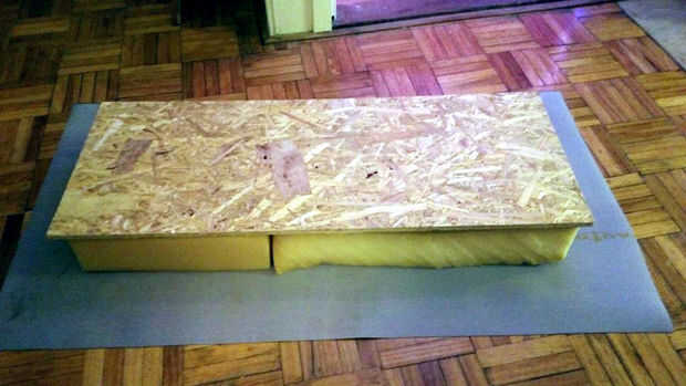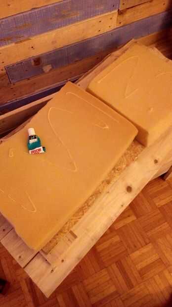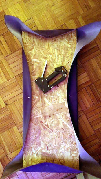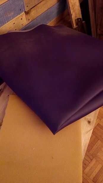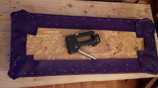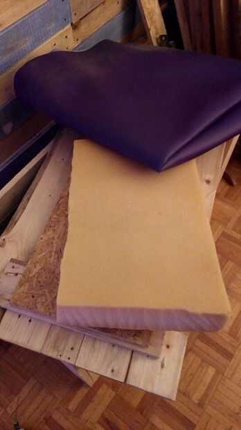 Tenía algún resto espuma ahí y había pegado dos piezas junto con Bisontix. Que pegados a la espuma de la madera de escama y que después cortar en tamaño, viró la polipiel morado alrededor de la espuma. Solo tratar de hacerlo de un lado y que la tachuela en el lado opuesto y tan redondo.