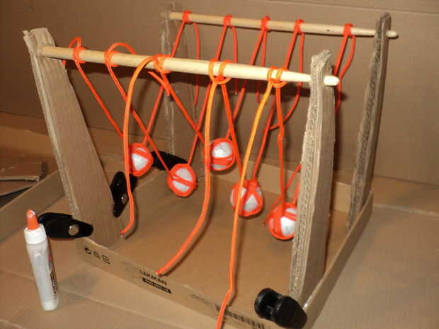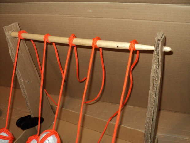 Idealmente, estará colgando bajo y flojo pero ajustar la longitud de ambos cables incluso y apretar el nudo. El espaciado de las barras de apoyo debe también ser uniformemente espaciado. Las bolas deben de estar balanceando cómodamente y no restringidas de movimiento.