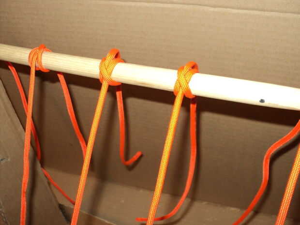 Usé un ballestrinque común para fijar el extremo de la cuerda en el travesaño. Hay muchos instructables de nudo que le muestran cómo atar este nudo simple.