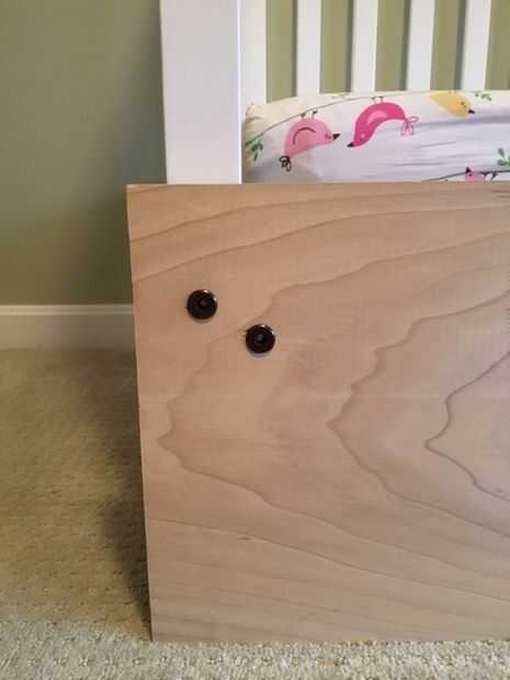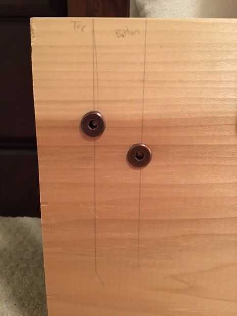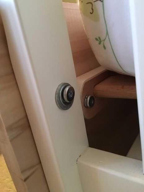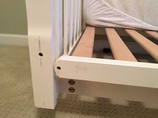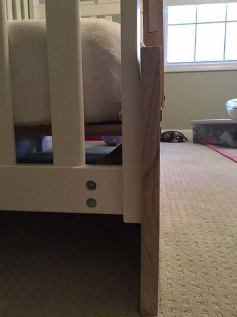 1. perno medir altura: hay cuatro lugares donde se une la parte delantera de la cuna son iguales en ambos lados, uno se fija a los postes y el otro a los listones que soportan el colchón. Mientras que la parte delantera de la cuna aún está puesta echa un vistazo a la parte posterior y mida la distancia entre el piso y cada uno de estos pernos. Ellos como fuera etiquetado (colocados en los soportes) y dentro (unido a los listones) acertar con esto hará que la cuna esté nivelado cuando se genera la nueva junta frontal.