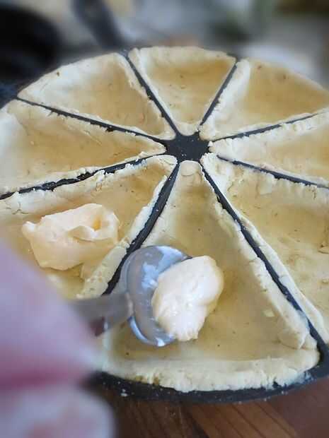 Una vez que tengas todas las cuñas preparadas, extender dos cucharadas de crema en la parte inferior de cada cuña.