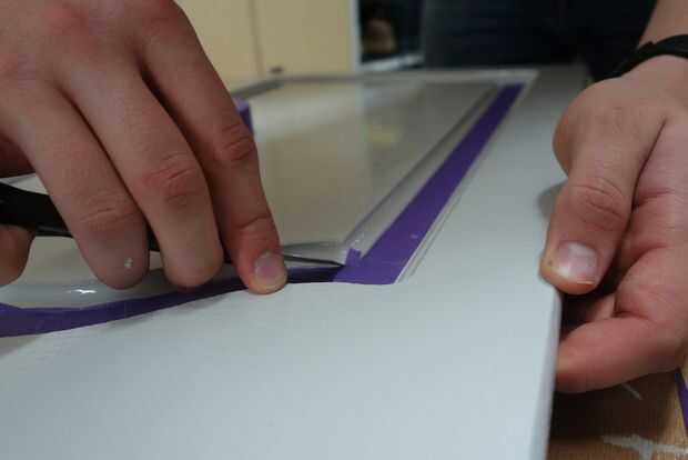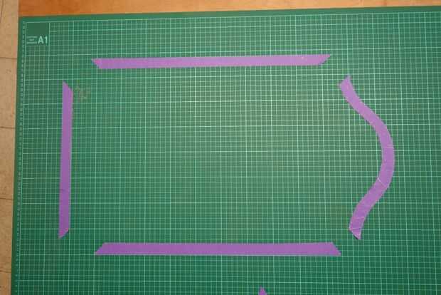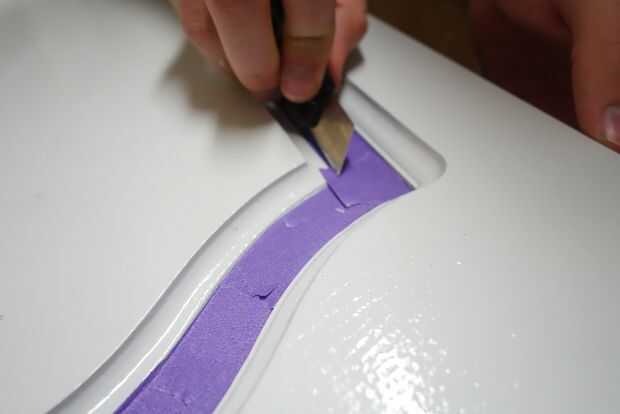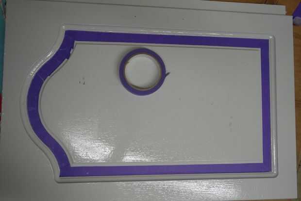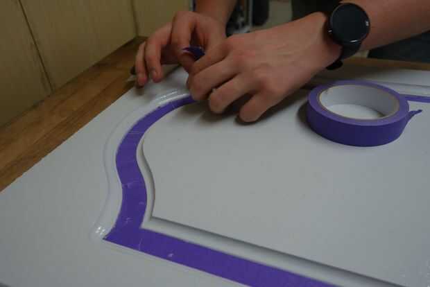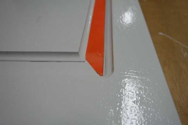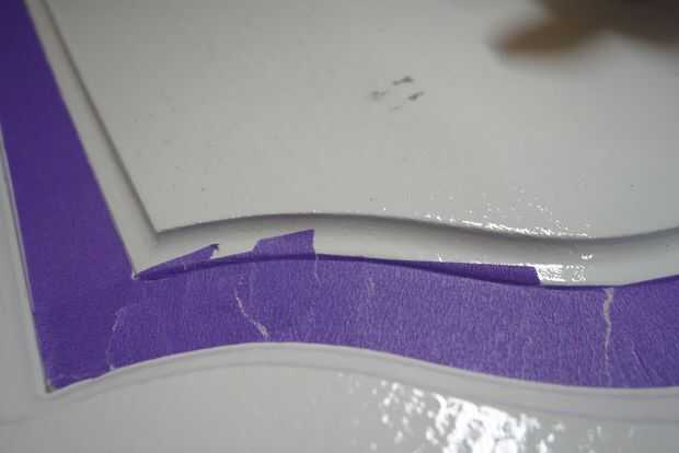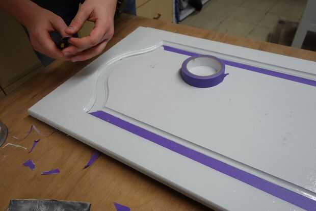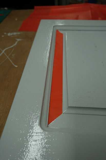Para aplicar decopatch a la incrustación en las puertas, quisimos probar una técnica diferente. Aplicamos cinta de pintor a la parte donde hemos querido aplicar decopatch. Luego recortar de la proyección de la cinta y se quedaron con una copia perfecta de la incrustación. La idea era cortar el decopatch exactamente este tamaño, pero esto resultó para ser demasiado difícil. En las últimas fotos ver que la esquina no encaja correctamente y la pieza de rizado en la parte superior era imposible cortar perfectamente.
