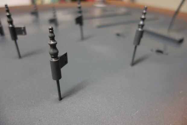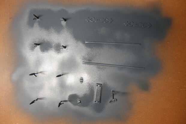 Tiempo a pintar las piezas de ferretería pequeña. Nos condujo a través de clavos de un viejo pedazo de cartulina y colocar todas las piezas de hardware en tal orientación que podríamos pintar todo a la vez. Comenzamos con una imprimación gris y terminar con 2 capas de pintura negra mate.