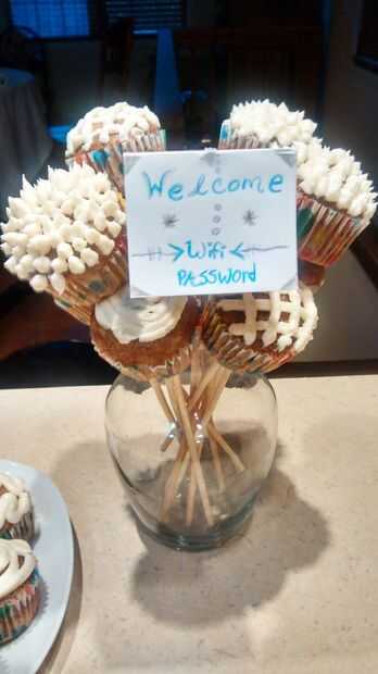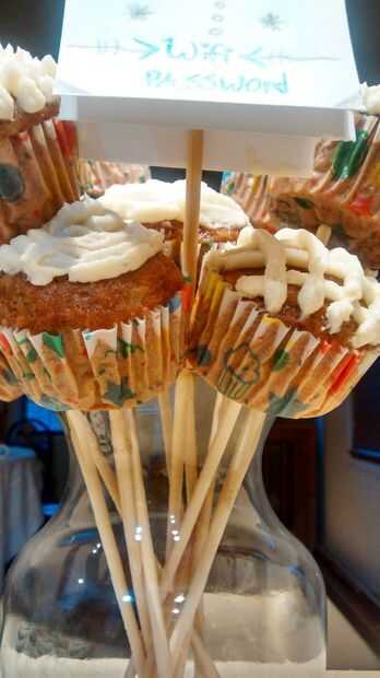 Ahora, para la nota poco wifi, simplemente tomé una notecard y doblé por la mitad y asomó un palo de brocheta por el centro superior; y eso brocheta por el centro de los otros cupcakes (véase cuadro 3).