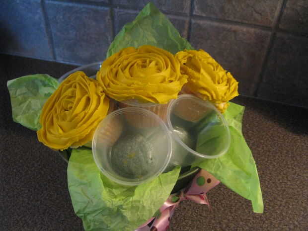Cupcake bouquets. Son cupcakes de tamaño completos decoradas como flores y dispuestas en macetas. Algunos se organizan en canastas de Pascua.