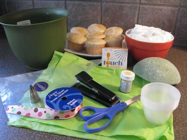Cupcake bouquets. Son cupcakes de tamaño completos decoradas como flores y dispuestas en macetas. Algunos se organizan en canastas de Pascua.