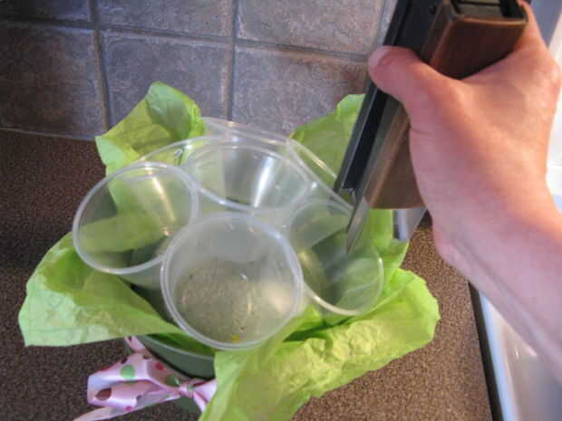 no sólo un bonito ramo de floresParte 1. La base deSuministros necesarios.  Florero, 13 (3oz) Dixie tazas, guirnalda hojas de 4 pies, caliente pegamento y pistola grapadora, cinta y alambre y tijeras1. Corte la parte inferior de 7 las copas.2. grapa