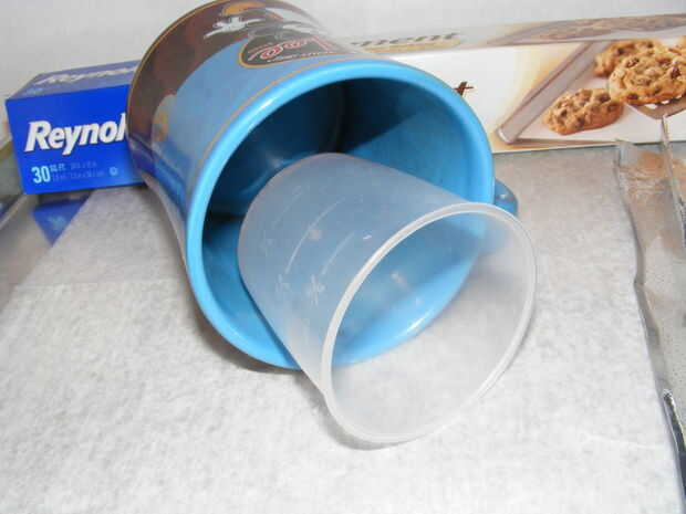 Un elemento a utilizar como la base para el molde, una lata pequeña, timbal, tiro la lata, vidrio,... Usé la taza de medición de mi olla de arroz. Acabo de ver que cabe dentro de la taza de café para que se formará una pared gruesa convenientemente para el Magdalena.