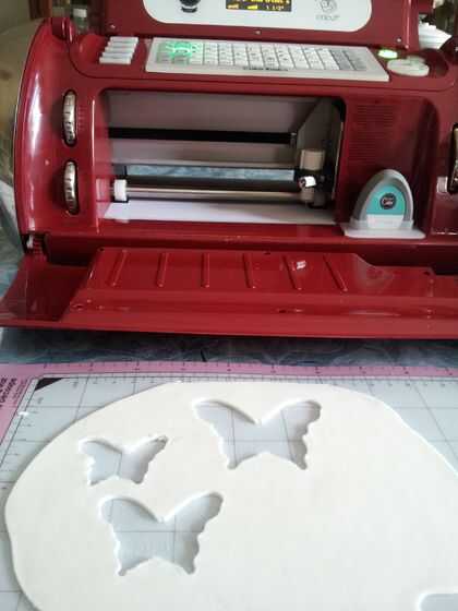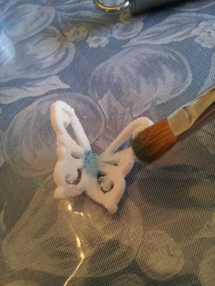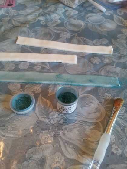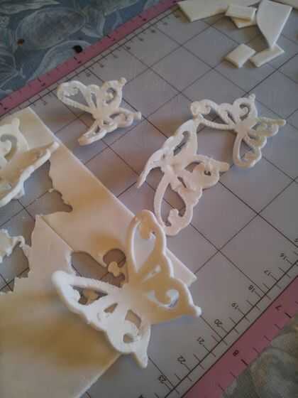 Estirar el fondant en una serpiente y el rodillo hacia fuera plana y larga. Tienes que medir tus pasteles para que sepas cuánto tiempo para hacer las "cintas" para cada nivel. Utilice su cepillo foodsafe al polvo el color sobre sus cintas y mariposas. Las mariposas deben secarse durante un día o menos de un libro o algo para darles un poco de movimiento. Pero necesitas las cintas que frshly hecho para que sea lo suficientemente flexibles para envolver alrededor de sus tortas. Luego simplemente coloque sus mariposas donde quieras. Ahora tienes un hermoso pastel poco impresionante.