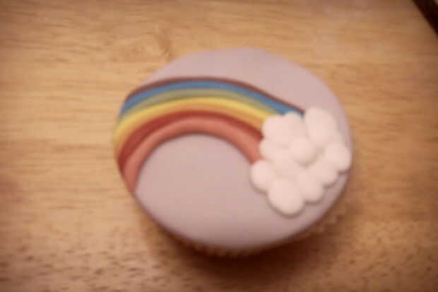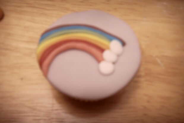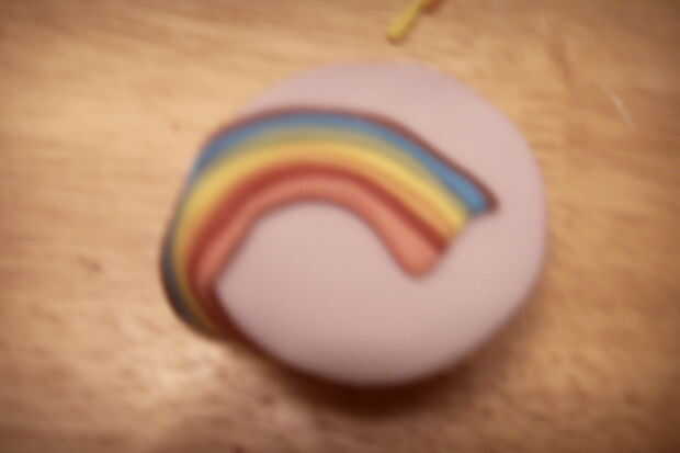Corte recto el lado derecho. Coloque el arco iris sobre el pastel en una curva (humedecer ligeramente el área que está mintiendo en con un pincel húmedo si bien no se pegue). Recorte el exceso en el otro lado, siguiendo la curva de la torta.