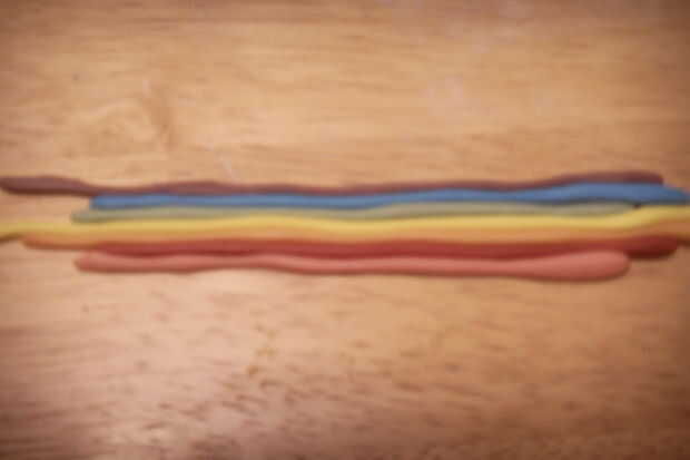 Extienda una fina 'salchicha' de pasta de azúcar en cada color del arco iris