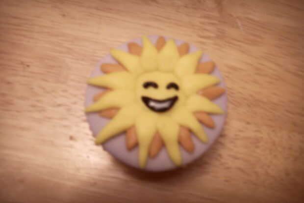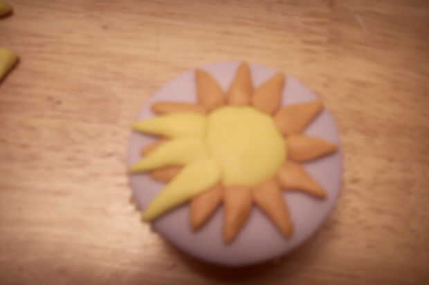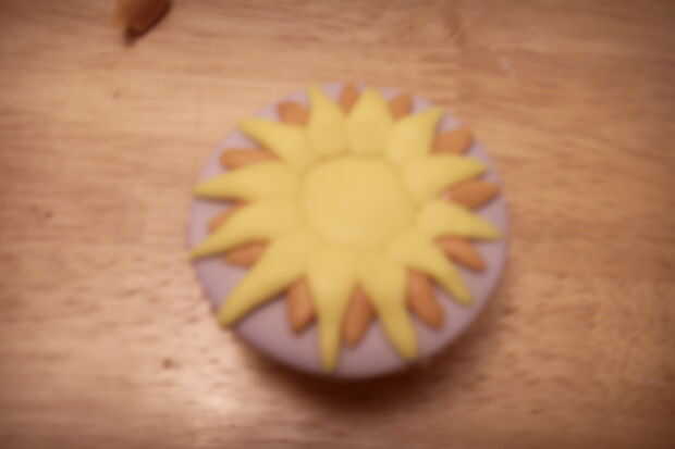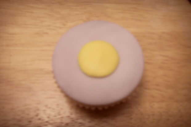 Aplanar en un círculo (o rodillo plana con un rodillo y cortar un círculo con un cortador de 1/2 el diámetro de la Magdalena). Pegar al centro de la torta.