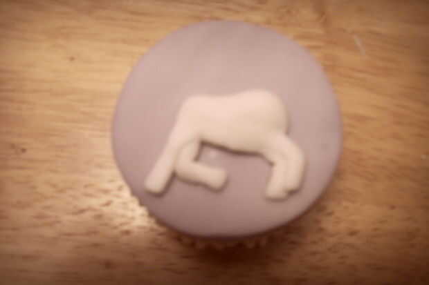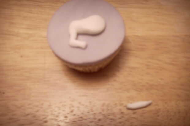 Hacer la forma de una pera pequeña (menos de 1/2 el tamaño de cuerpo), aplanar en la torta para hacer la cabeza. Añadir 1 pequeño cono gris para el cuerno y 2 conos blanco de orejas.