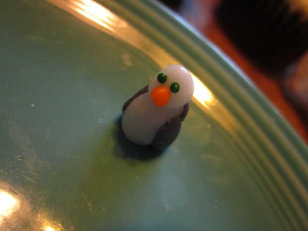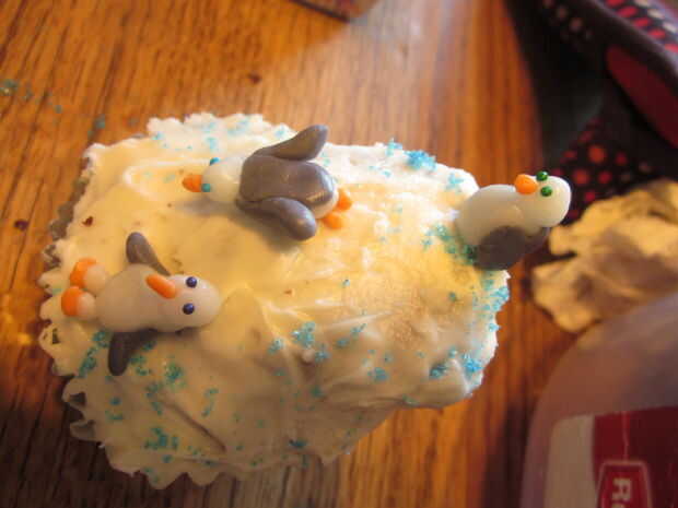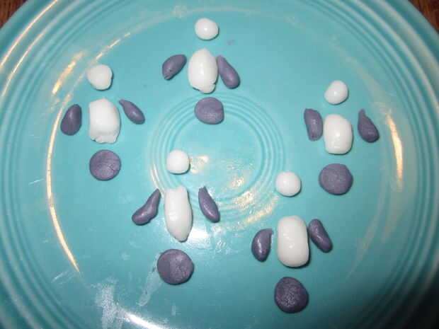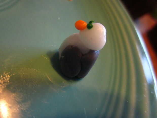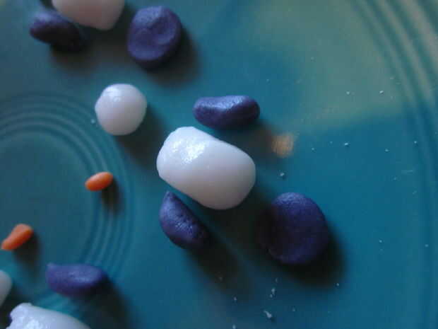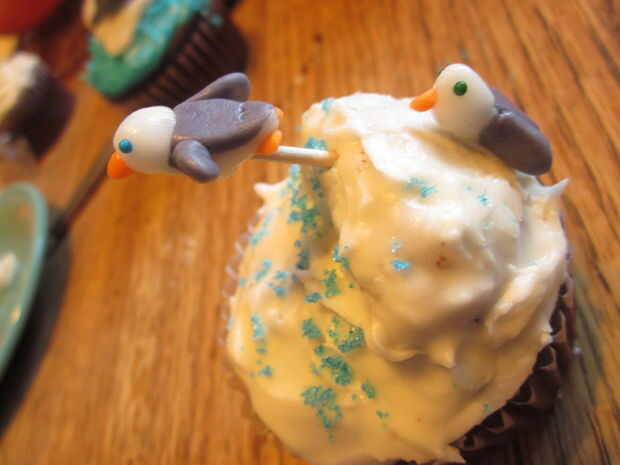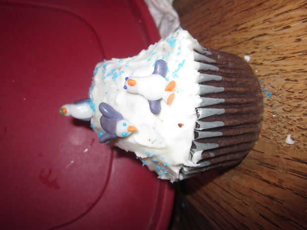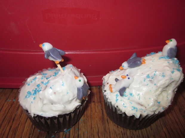 For the penguins slide you will need 3 of the 5 cupcakes. 2 de las bases y 1 para el corte en la diapositiva. Comience por cortar diagonalmente 1 cupcake en medio, va a utilizar la mitad superior como la sección de la diapositiva grande. Cortar la parte áspera redondeada por lo que es en ese lado. A continuación cortar la ronda dos bordes de modo que se deslice en forma. Utilice uno de los trozos que ponga a un lado para el otro lado de la diapositiva (en el otro de la Magdalena). En las fotos que prendieron los pedazos de la diapositiva antes de helar, pero pronto se dio cuenta de que debo haber helado los cupcakes helada el pedazo pequeño tobogán y coloque en su lugar... (el diapositiva pieza izquierda un montón de migas que eran difíciles de bajar, aunque si tuvieras pastel blanco estaría bien) Las heladas en helar blanco. Mientras que el glaseado es sprinkles de azúcar azul todavía pegajosa espolvorear alrededor de la Magdalena. A continuación va a salir el pastillaje (fondant)-tomar un poco del blanco y agregar colorante para cualquier color que quieras tus pingüinos que... Casualmente como púrpura pingüinos:) no necesita mucho fondant para estos chicos poco. También, si usted quiere una naranja el pico y los pies, puede hacer fondant naranja, usted necesitará apenas fondant en todos, probablemente del tamaño de un cuarto... Hice 5 pingüinos. Forma las partes del cuerpo, alas y cabezas todo por separado. una vez que tengas las formas principales que usted puede comenzar a hacer tus pingüinos, primero tomar la parte del cuerpo principal (blanco) y la forma oval y squish el redondo aplanado círculo morado a un lado (los pingüinos atrás). A continuación tome las piezas del ala y les aplaste un poco y pulsa. luego tomar la cabeza y añadir un poco naranja pico de fondant y usted también puede añadir ojos espolvorear si quieres. Por último pulsa en los pies. Se puede colocar sin embargo desea que en el tobogán de nieve. Quería tener uno en el aire, por lo que lo coloca en la mitad de un palillo clavado en la diapositiva de la Magdalena.
