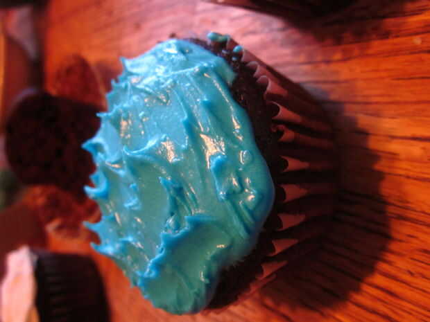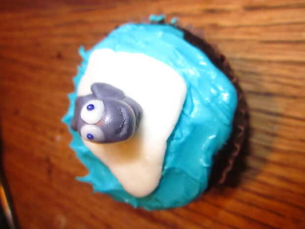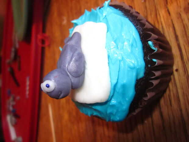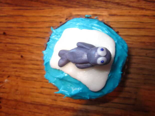 Poner este sello la Magdalena vas a querer hacer algunas de tu helar blanco azul. He añadido un par de gota al blanco para que sea un azul brillante, usted podría agregar más o menos azul colorante para que sea más claro o más oscuro. Utilicé la parte trasera de una cuchara para untar el glaseado en, algo tiene ese efecto de onda. El iceberg, aplana un trozo de fondant blanco en la forma deseada y colocarlo en el Magdalena. Para hacer el sello, color un poco del fondant (otra vez se puede utilizar cualquier color que te gusta... He utilizado el morado) y forma en una parte del cuerpo grande (que tendrá una cola en la forma), 2 aletas y una cabeza, los ojos grandes he usado un punto diminuto de fondant blanco con una gota pequeña en su interior. También dibujé una sonrisa de él usando un palillo de dientes... Posición de la cabeza y aletas en el cuerpo y ponerlo en el iceberg! Más tarde rociada sprinkles de azúcar azul en darle un efecto hielo.