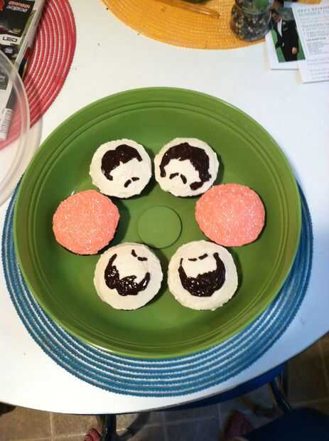 Pintar el stencil con la ganache, entonces deje el ganache para un minuto o así y entonces pelado de la plantilla. Se hornean cepillos específicos que se venden en la tienda de artesanía que gran trabajan para esto (creo que la pintura de los niños por clase de números de pincel, pero no arrojan). Repita el proceso para los cuatro miembros de Beatles.
