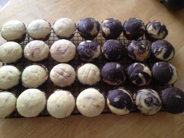 Verter en molde de cupcake que ya forrado con envolturas de la Magdalena, ya sea blanco mezcla chocolate o primera masa primero y remolino con pincho/palillo/cuchillo para crear efecto de mármol.