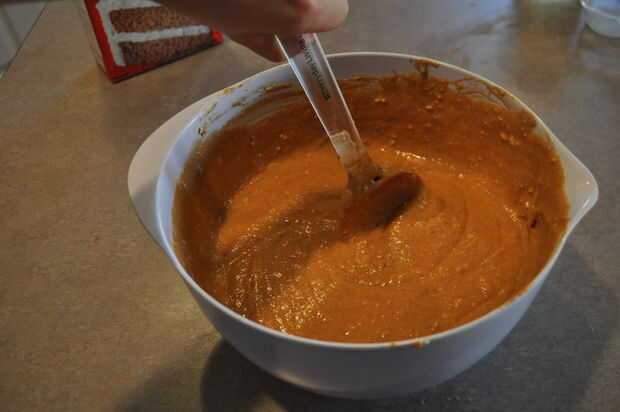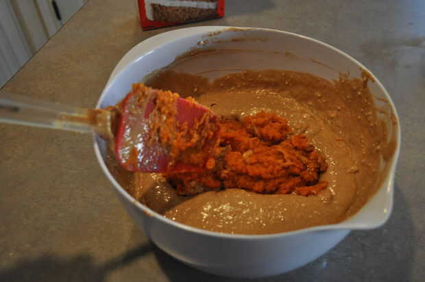 Mezcla de calabaza en la mezcla con una cuchara de mezcla hasta que quede suave.