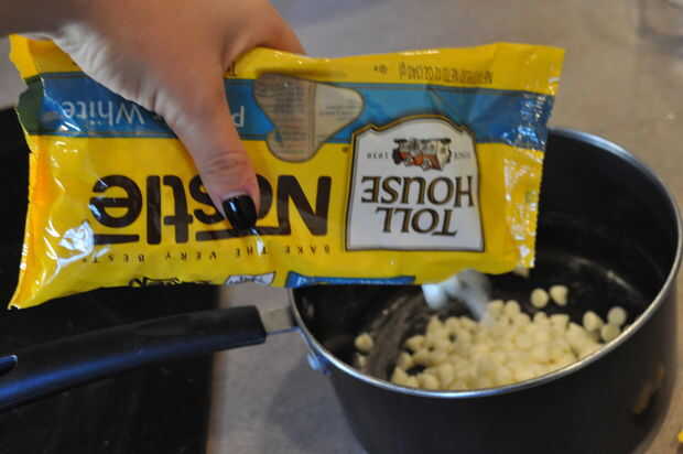 Abra la bolsa de chips de chocolate blanco. Vierta chips de chocolate en la cacerola pequeña.
