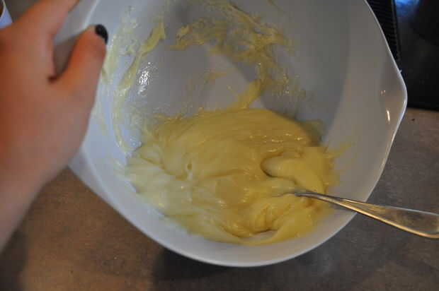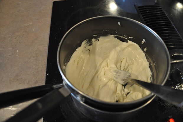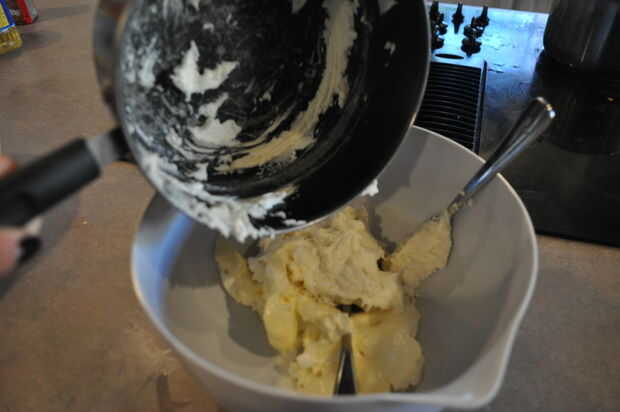 Una vez chocolate blanco derretido y suave, quitar pequeña cacerola de la estufa. Añadir el chocolate blanco a la mezcla de queso crema de mantequilla. Mezclar todos los ingredientes con un tenedor hasta que quede suave.