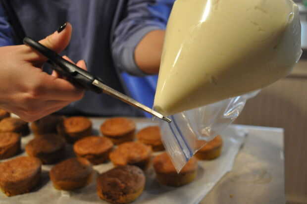 Una vez cupcakes en papel de cera, tome la bolsa de helar. No cierre la bolsa cerrada. Mueva el glaseado en una esquina de la bolsa de ziplock. Tomar la tijera y cortar una pequeña porción de la esquina. (en la foto)