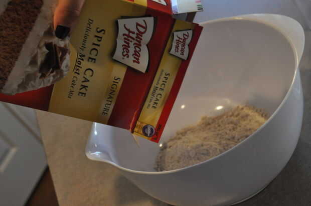 Abrir la caja de mezcla de torta de especias y verter la caja completa en tazón.