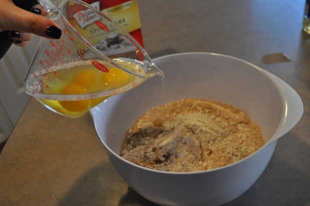 Ingredientes:mezcla para pastel oro 1 caja1 taza de harina1 taza de azúcar1/2 taza mantequilla de maní1 taza de crema agria4 claras de huevo1 1/3 tazas de agua2 cucharadas de aceite vegetalDirección:Mezclar los ingredientes secos. Añadir el resto de