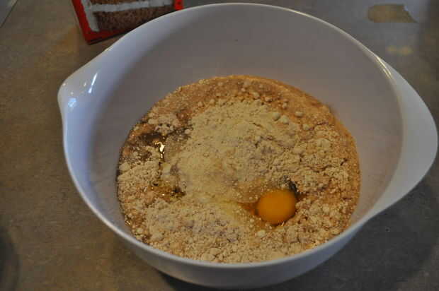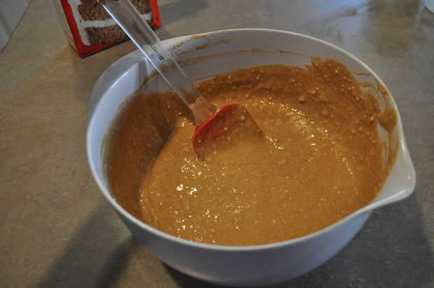 Ingredientes:mezcla para pastel oro 1 caja1 taza de harina1 taza de azúcar1/2 taza mantequilla de maní1 taza de crema agria4 claras de huevo1 1/3 tazas de agua2 cucharadas de aceite vegetalDirección:Mezclar los ingredientes secos. Añadir el resto de