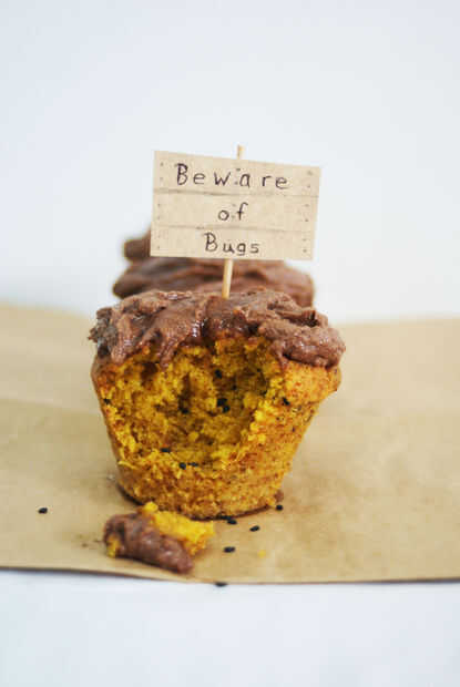 Así que al morder los adorables e inocentes cupcakes y descubrir algunas cosas negras dispersas (grrr), la asociación no está hasta ahora lejos. Si usted está teniendo problemas, un lindo cartelito de "Cuidado de los errores" debe dejar claro. Este no es el lugar donde usted espera semillas como en limón-semillas de amapola pan – no, no en cupcakes de calabaza. Sin embargo, los "bichos" no son más que unas semillas de sésamo negro dispersos o semillas de linaza (te oigo reír en relieve), pero no te dice a tus invitados. Hacerles entender que....