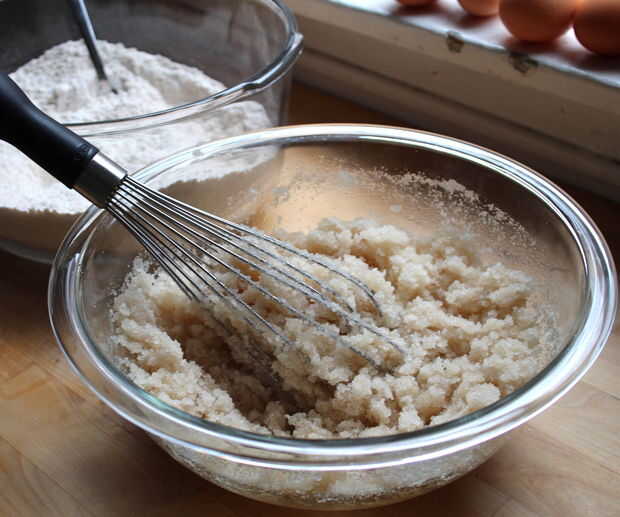 Combinar el aceite y el azúcar en un tazón y bate bien durante un minuto más o menos hasta que no haya ningunos pedacitos secos de azúcar izquierda.