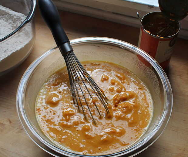 Mezcle la calabaza en los ingredientes húmedos hasta que combinado - no tarda mucho tiempo. :)