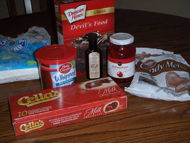Super dulce tratamiento para día de San Valentín!cerezas al marrasquino de 12 oz.3 y 3/4 tazas en polvo de azúcarHojuelas de coco 14 oz ralladoleche condensada de 14 oz endulzadochocolate dulce de la semi de 12 oz1 cdita de vainillapapel de ceratoall
