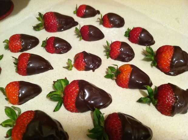 Sumergir cada fresa la mitad de la ganache entonces establecer en papel de cera se endurezca.