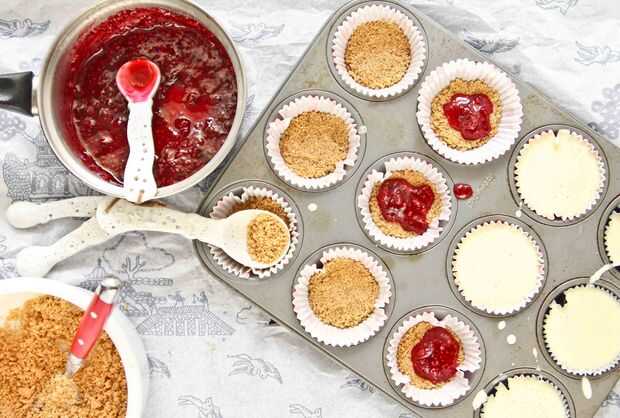 Precalentar el horno a 325 grados Fahrenheit. Salir de su bandeja de Magdalena y en papeles pintados/capa. Colocar 1 cucharada de la mezcla de galleta en el fondo de cada copa, en el fondo de la taza con el dorso de los dedos rizados. Luego, colocar 1 cucharadita de la jalea de frambuesa en el centro de cada una de las cortezas de la galleta. A continuación, llenar cada taza 3/4 lleno con la mezcla de cheesecake. Coloque la bandeja en el horno y hornear por 8 a 10 minutos, luego el calor a 275 grados Fahrenheit y continuar hornear de 12 a 16 minutos, o hasta la parte superior de la tarta de queso esté dorada. Se agrieta en la parte superior, y eso está bien, porque nos va cubriendo las grietas con crema batida.