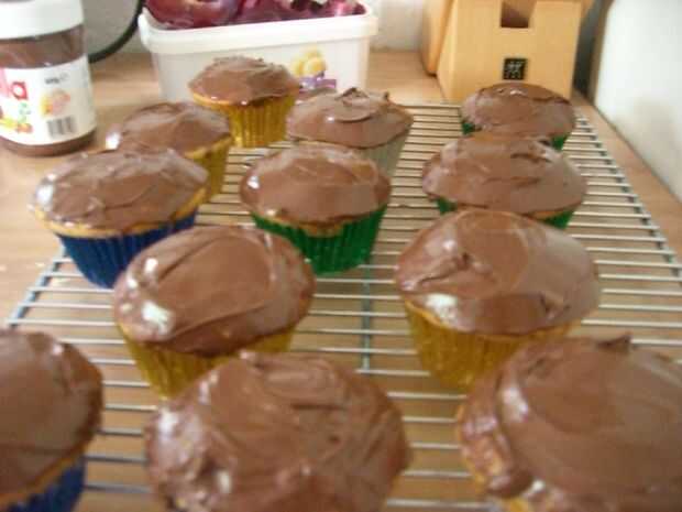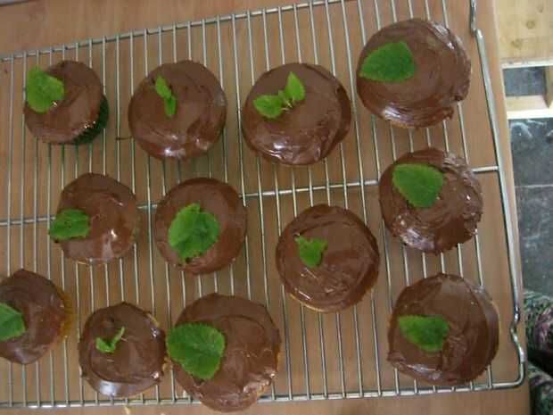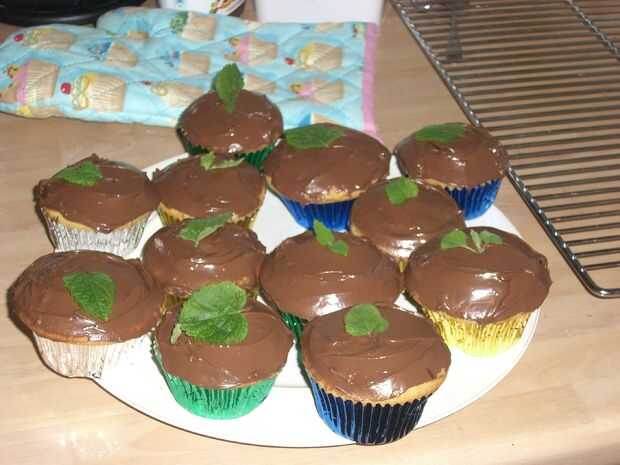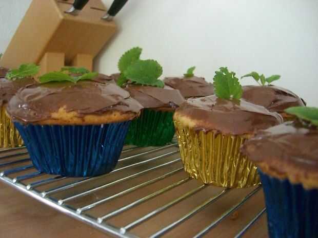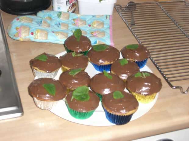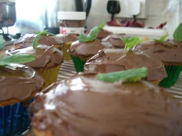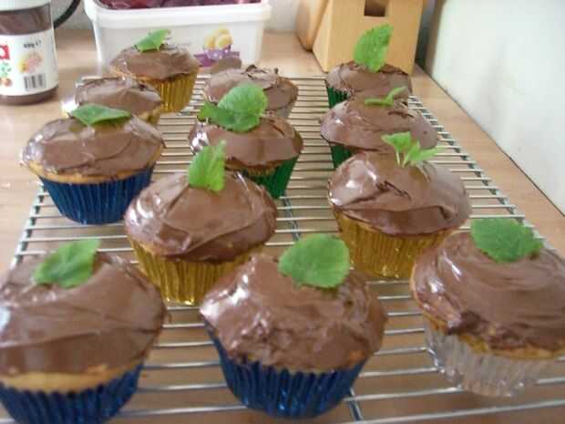 Después de que se hayan enfriado, repartidos los cupcakes de Nutella y cubra con una hoja de menta.