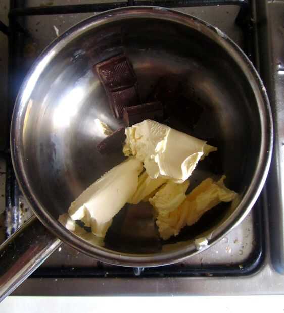 En primer lugar, poner la mantequilla y el chocolate en un cazo y calentar ligeramente, revolviendo, hasta que se derritan completamente.