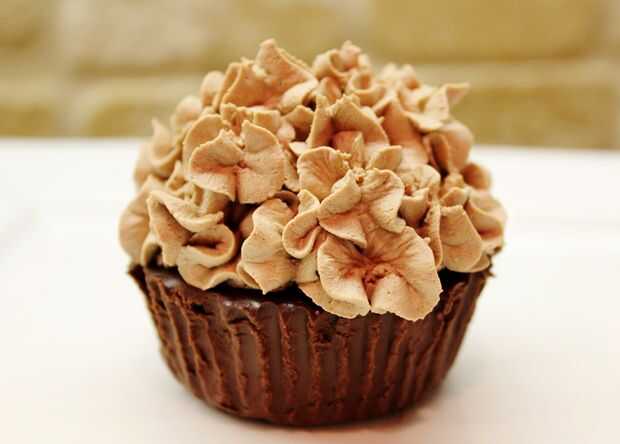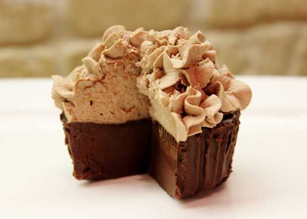 5. cuando esté listo para servir sus magdalenas y todo es bonito y sólido en el frigorífico, retire el papel para horno de sus magdalenas y la pipa de la crema batida de chocolate en la parte superior como helar. Servir frío.