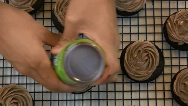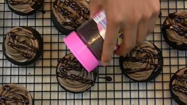 Poner la crema en una manga pastelera con una punta de estrella grande. Desde el centro del cupcake y pipa en una espiral hacia afuera. Al acercarse al borde de la Magdalena, disminuir la presión para crear un extremo afilado. Luego, utilizando una botella con una punta de apriete o una manga pastelera, llovizna algunos ganache por encima y espolvorear con algunos de sus ingredientes.