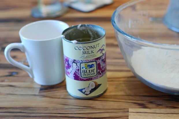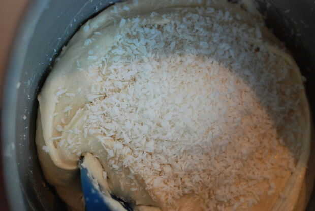 4. tamizar las dos harinas junto y mida la leche de coco. Añadir un tercio de la harina a la mezcla para pastel y batir bien. Añadir un tercio de la leche de coco y batir bien de nuevo. Repita estos pasos hasta Añadir toda la harina y la leche de coco.