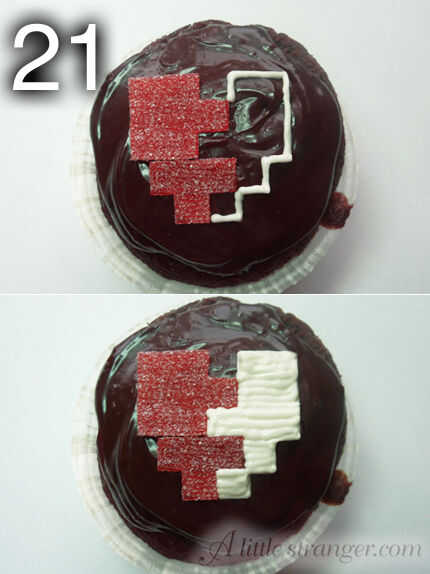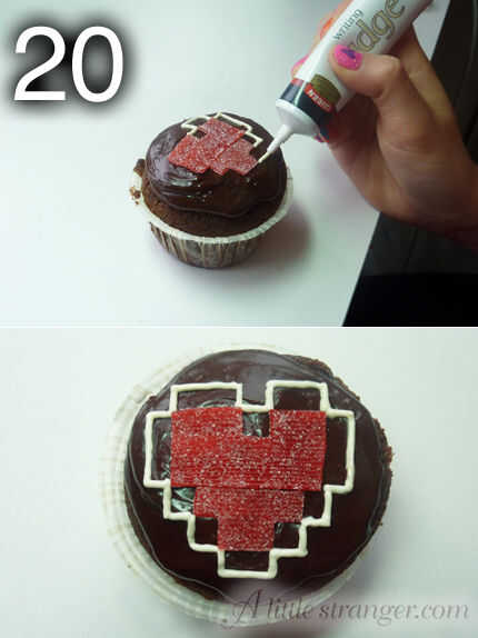 18) hacer cuatro corazones y cortar el cuarto que está en la mitad. Esto será el corazón sin llenar al final. Pulsa el corazón en cada cupcake. Dejar que se establece durante al menos media hora, de esta manera la superficie establecerá un poco así que si usted comete un error con la guinda que puede corregirse fácilmente.