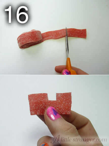 16) tome su rollo de dulces y corte una sección de aproximadamente 6 cm de largo, recortar que se vea como la mitad superior del diagrama 15