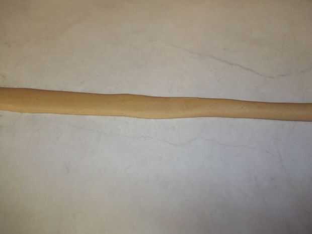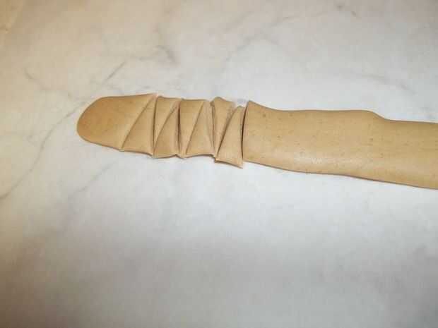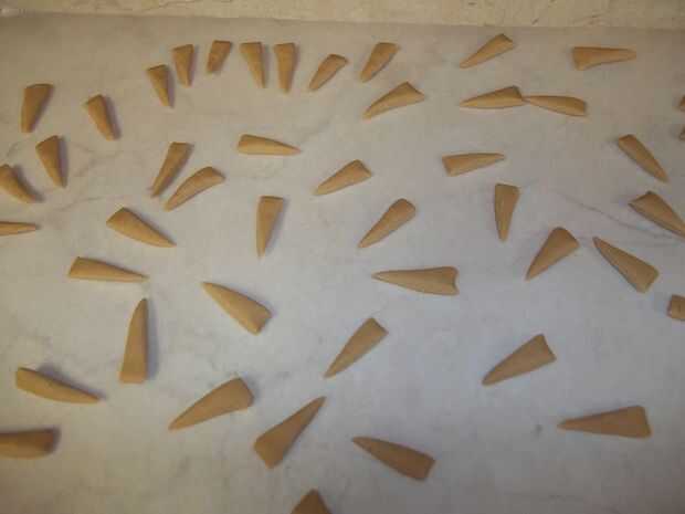 Estirar el fondant en una cuerda de 1/4" de espesor. Presione la cuerda plana. Usando tijeras o un rebanador de pizza, cortar esta cuerda aplane en triángulos por poco acentuados. Colocar los triángulos en papel de pergamino o papel encerado, afilado de los puntos a medida que avanza y asegurándose que el extremo plano de los triángulos se presionan hacia abajo.