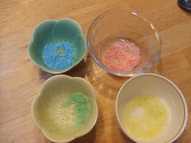 el azúcar totalmente mezclado con el colorante.