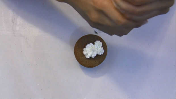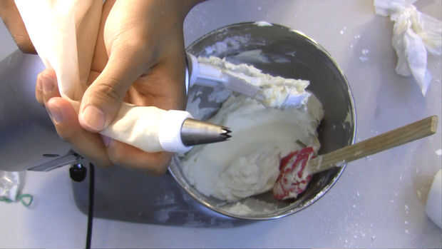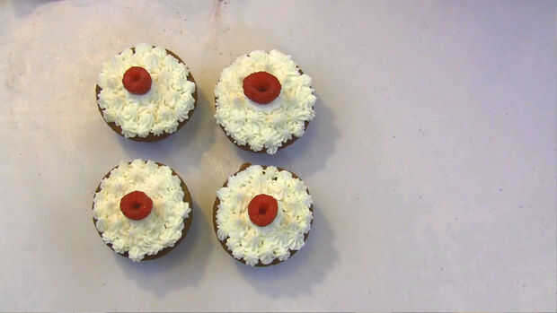 Llene el buttercream en una manga pastelera con una punta de estrella de tamaño medio. Tubo un gran montículo en el centro de la Magdalena y añadir más pequeños montículos alrededor del montón grande. Los montículos deben recibir más pequeño y más pequeño que cerca del borde de la Magdalena. El añadir una frambuesa a la parte superior del montículo de centro.