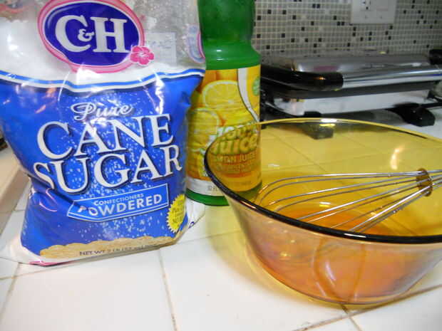 Mezcla de una taza de en polvo azúcar en un bol con una cucharada o dos de jugo de limón puro. Remar y espesar con una espátula o con un batidor. Sólo tenga en cuenta que un bate a recoger un montón de la cubierta y usted a perder tiempo y helar tratando de raspar todas!