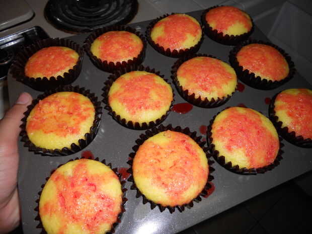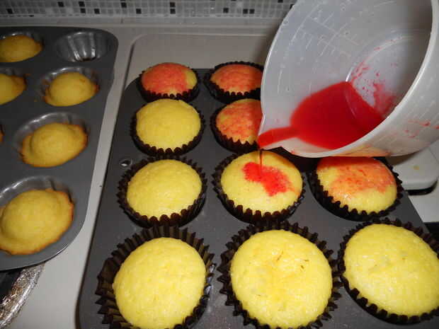 Rocíe la gelatina sobre cada cupcake, lo que le permite disfrutar a través de los agujeros que hiciste anteriormente. Colocar los cupcakes en la nevera y enfriar durante unas 2 horas.
