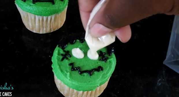 Una vez más, tomar el negro glaseado de antes y tubos pequeños puntos negro en el centro de los blancos. También es un gran lugar para personalizar los cupcakes. Aquí, usted puede hacer la dirección de los ojos diferentes en todas sus magdalenas.