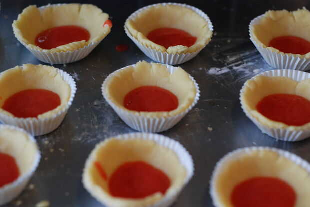 LUEGO LLENAMOS LA MISMA CANTIDAD DE PURÉ DE FRESA EN CADA TAZA.