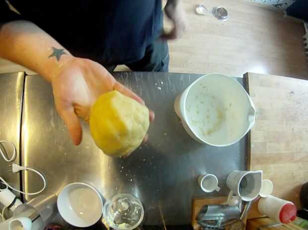 COMO LA MASA, AÑADIMOS TODOS LOS INGREDIENTES EN UN RECIPIENTE UNA MEZCLA CON UNA BATIDORA A UNA AGRADABLE Y MEZCLA DE BATIDO DE FRUTAS.